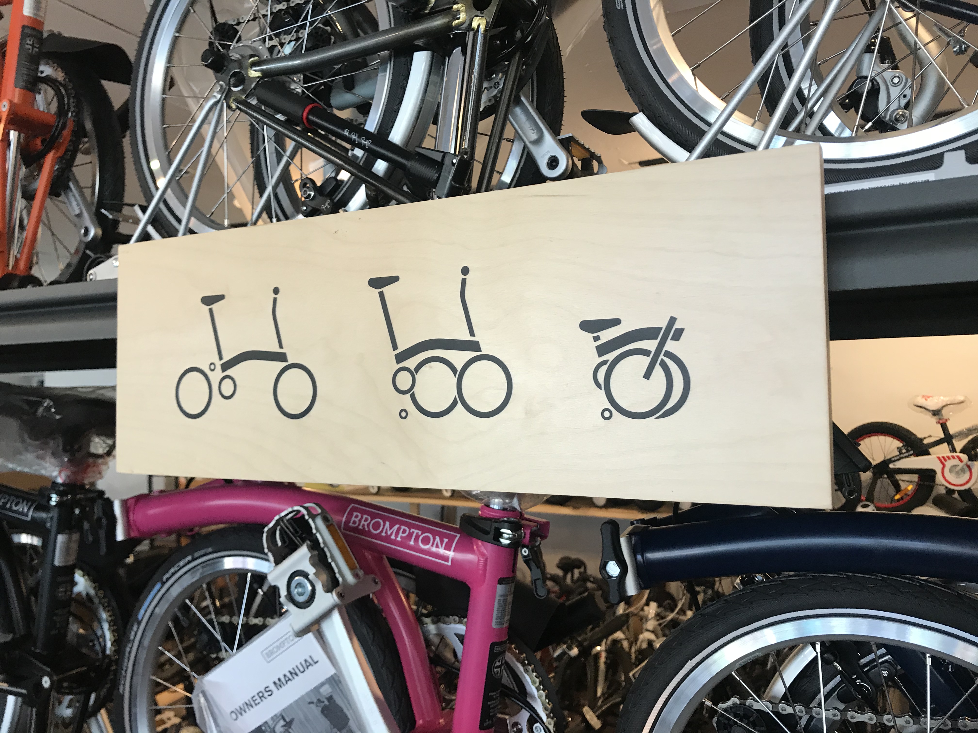 한눈에 보이는 브롬톤 로고와 브롬톤 브랜드 네임이 전시대에 걸려 있습니다.